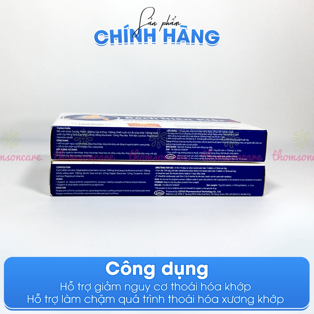 Mỗi viên chứa: Cao hy thiêm: 300mg; cao lá chay: 100mg; chiết xuất vỏ liễu (cao khô -15% Sali -cin): 100mg; Chiết xuất cây móng quỹ (cao khô -20% Harpagosides): 25mg; ĐỒng gluconate: 12mg.