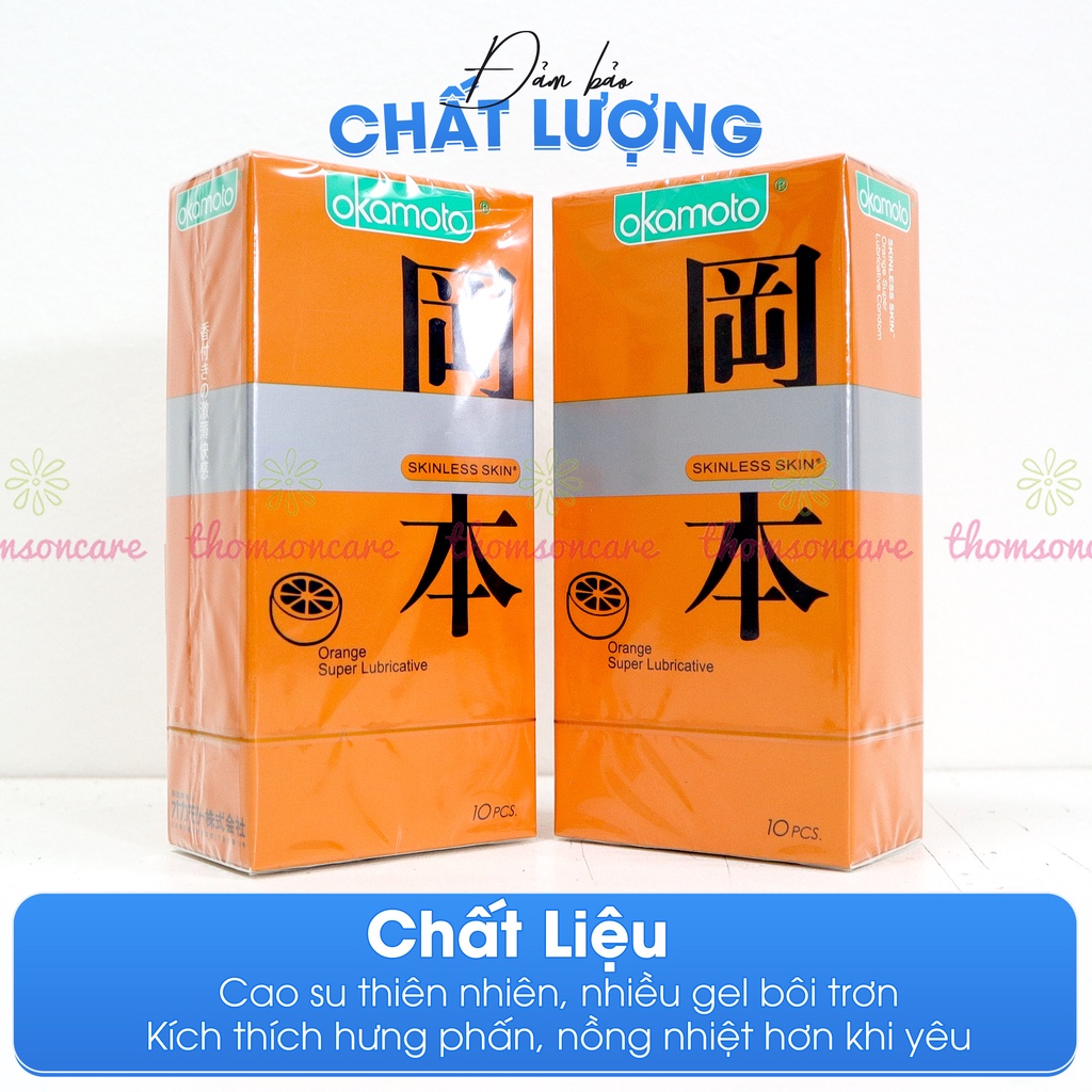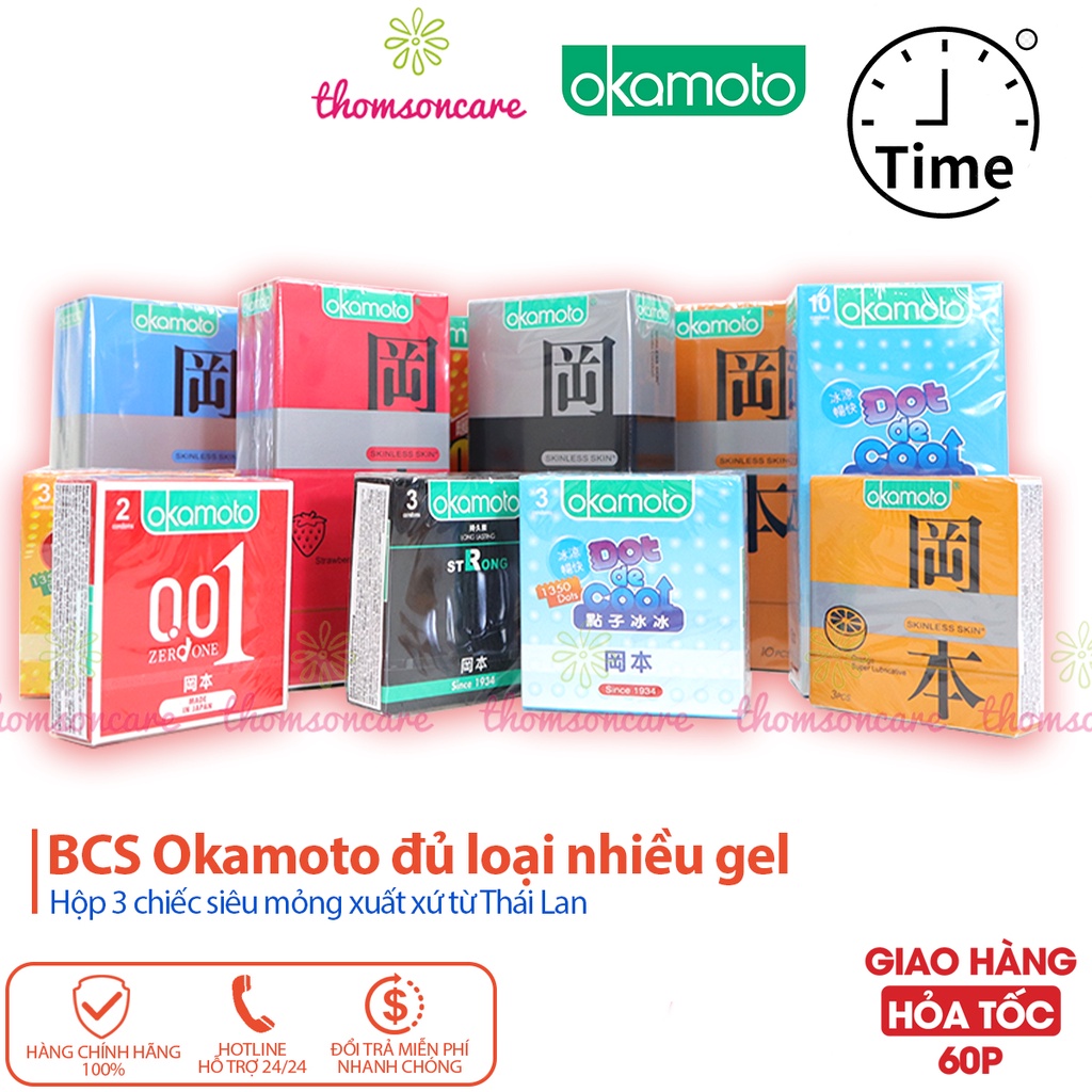 Bao cao su Okamoto siêu mỏng – Đủ loại hương dâu, cam, vani, nhiều gel bôi trơn, gai ấm nóng, gai lạnh kéo dài thời gian.