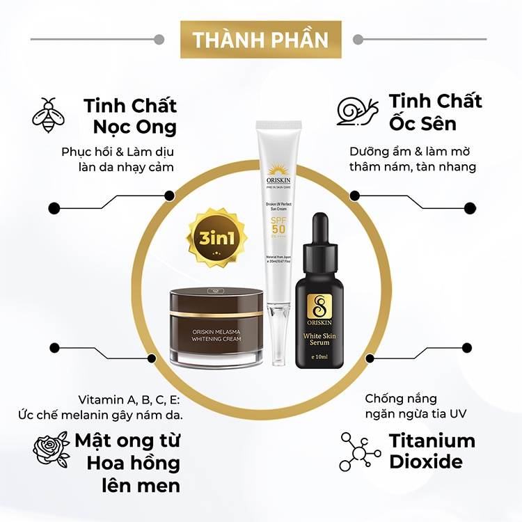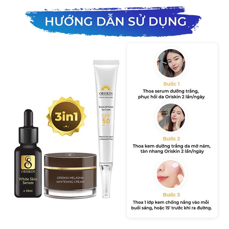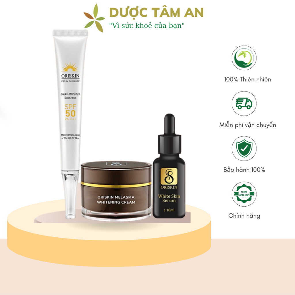 Bộ sản phẩm bao gồm 1 kem dưỡng giảm Nám lớn ORISKIN MELASMA WHITENING CREAM 20g và kem chống nắng ORISKIN UV PERFECT SUN CREAM 20ml
