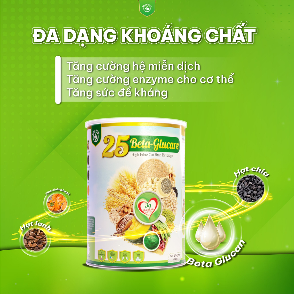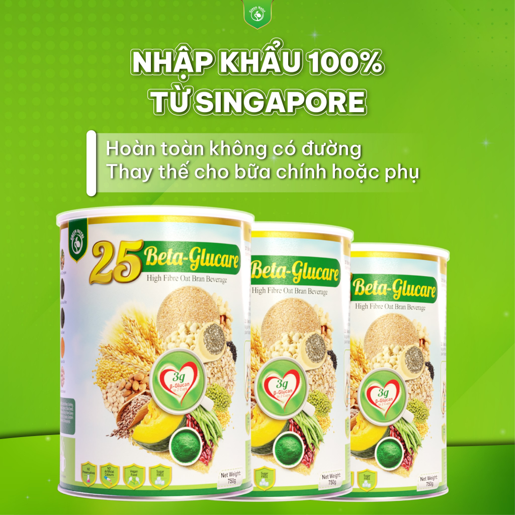 Sản phẩm nhập khẩu 100%, thương hiệu Singapore . 25 Beta Glucare là sản phẩm thuần chay, không chứa đường tinh luyện và có thể thay thế cho bữa ăn phụ.Sản phẩm phù hợp với mọi lứa tuổi, hương vị tự nhiên, thơm ngon, dễ uống, dễ hấp thu.