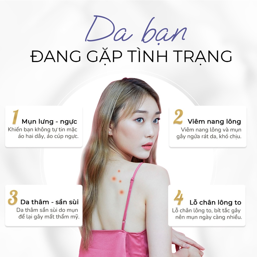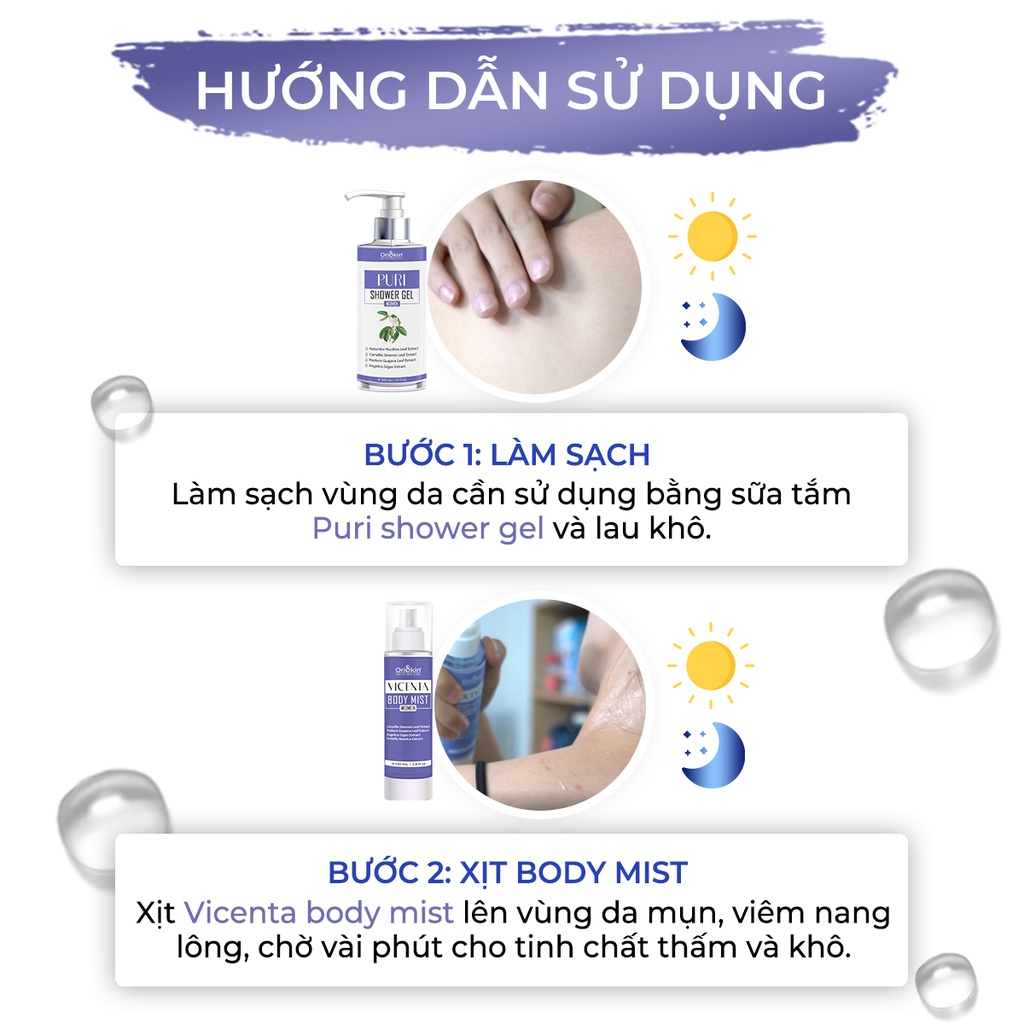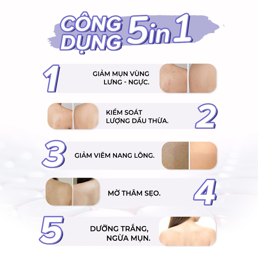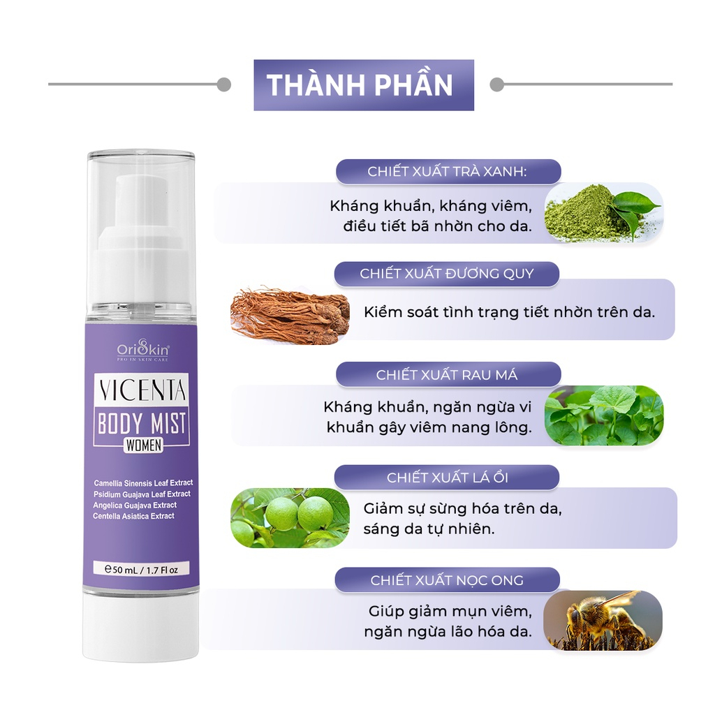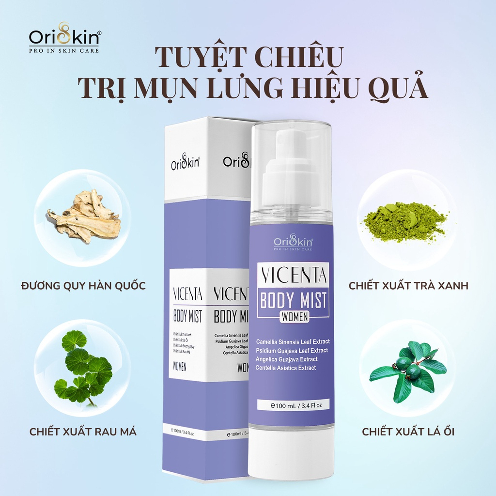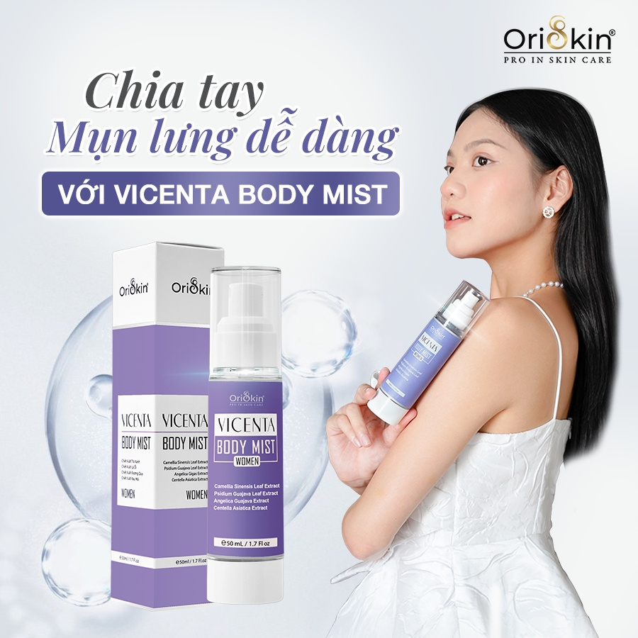 Sản phẩm lưng Vicenta Body Mist dành cho nữ với các công dụng giúp hỗ trợ làm giảm các loại mụn. Giúp các chị em phụ nữ lấy lại làn da trắng mịn hết mụn, tự tin đón mùa hè rực rỡ. Nhờ vào các thành phần thiên nhiên nổi bật: Chiết xuất trà xanh, chiết xuất lá ổi, chiết xuất rau má,… và công nghệ Nano – Liposome hiện đại giúp dưỡng chất thẩm thấu sâu hơn, hỗ trợ lấy lại làn da mịn màng, sạch mụn nhanh chóng.