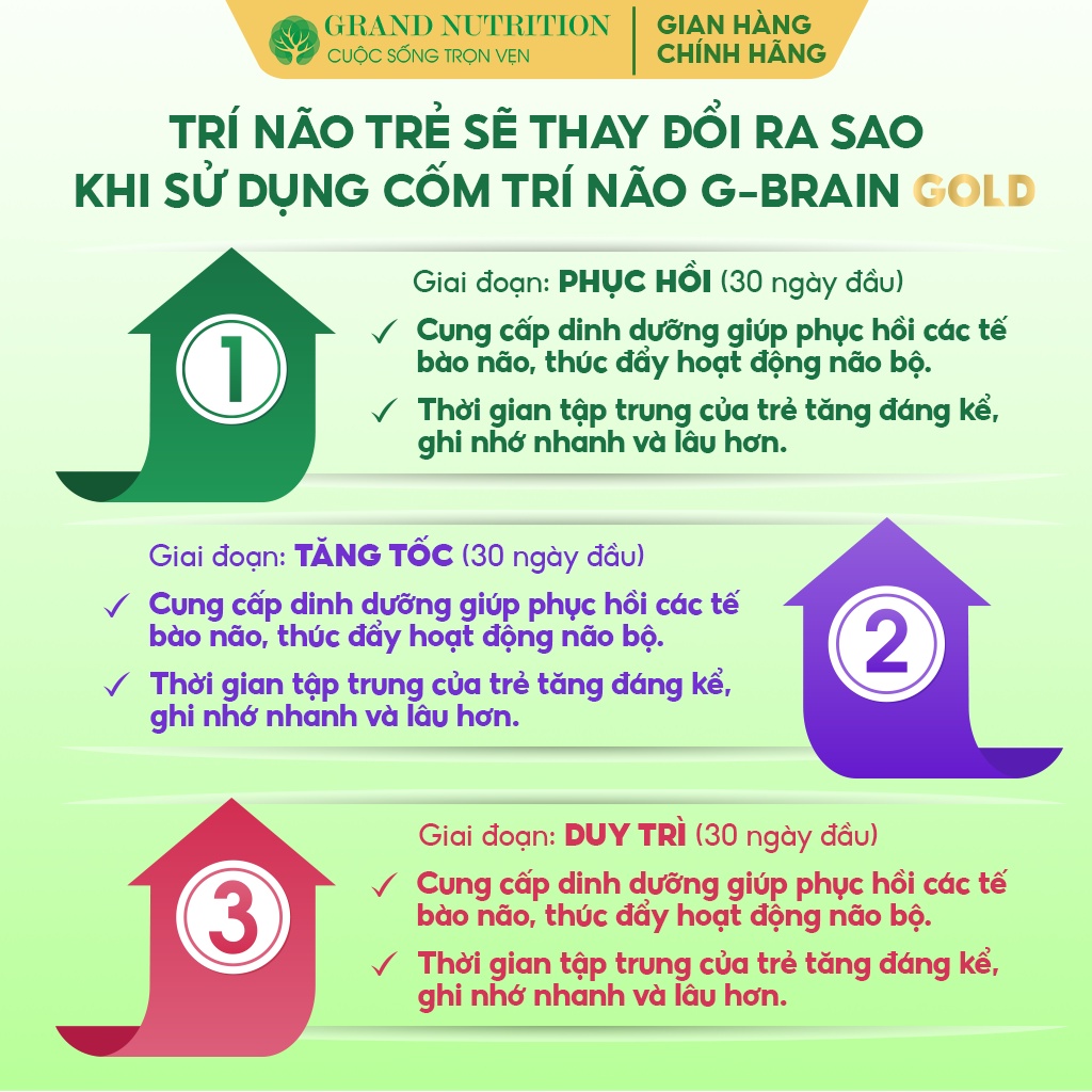 CỐM TRÍ NÃO G-BRAIN là sản phẩm dạng cốm, giúp chăm sóc não bộ chuyên sâu, hỗ trợ cải thiện tình trạng mất tập trung, trí nhớ kém, học trước quên sau ở trẻ.