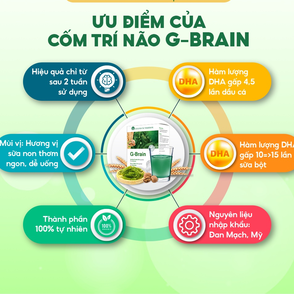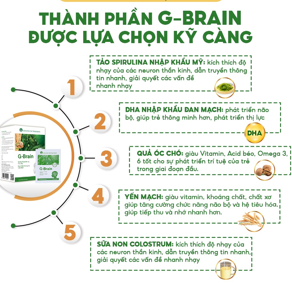 Cốm trí não G-Brain là sự kết hợp giữa dinh dưỡng và giáo dục. Với các thành phần hoàn toàn tự nhiên: chiết xuất từ Tảo xoắn Spirulina và sữa non Colostrum nhập khẩu từ Mỹ, tinh chất DHA nhập khẩu từ Đan Mạch, chiết xuất quả óc chó, bột yến mạch, hoa cúc tím,…