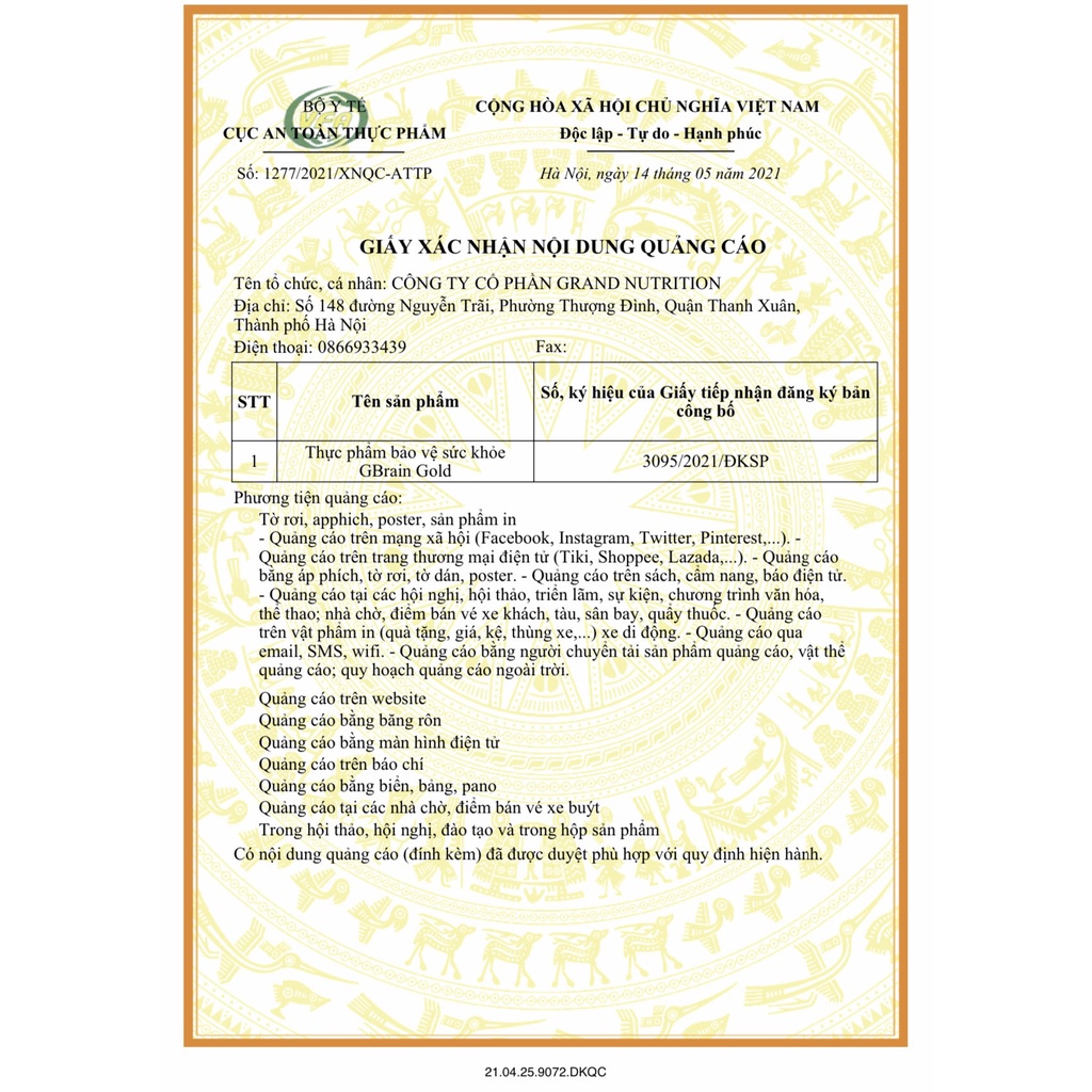Cốm trí não GBrain Gold được Bộ Y tế chứng nhận chất lượng an toàn vệ sinh, đạt tiêu chuẩn GMP.