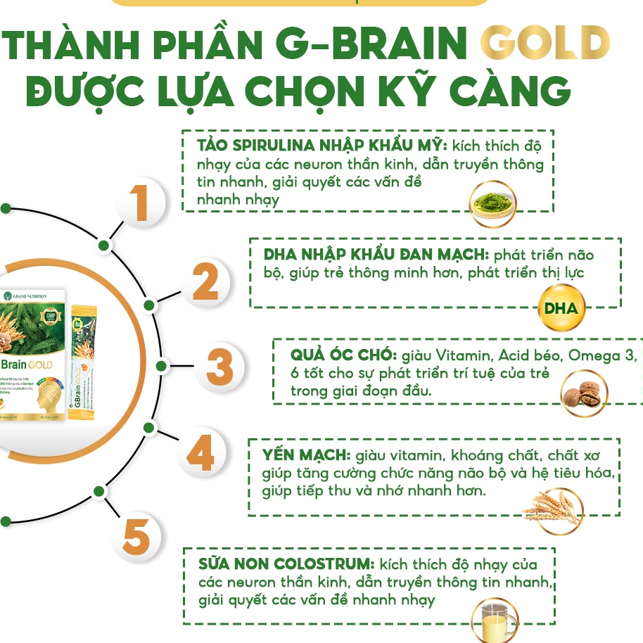 Cốm trí não GBrain Gold giữ nguyên những thành phần ưu việt từ Cốm trí não G-Brain, tập trung cải tiến và nâng cao hàm lượng tảo xoắn Spirulina gấp 1,5 lần. Từ đó, hàm lượng DHA có trong CỐM TRÍ NÃO GBRAIN GOLD gấp 2 lần Cốm trí não G-Brain thông thường, hiệu quả được đánh giá cao gấp 3 lần. Thành phần dinh dưỡng đặc biệt là chiết xuất nấm men giúp hỗ trợ hệ tiêu hóa, nâng cao sức đề kháng; giúp trẻ ăn ngon miệng với hương vị cam tươi mới.