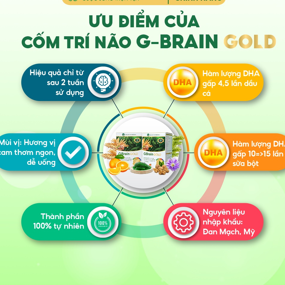 Cốm trí não GBrain Gold là sản phẩm dạng cốm, giúp chăm sóc não bộ chuyên sâu mang nhiều cải tiến mới, hiệu quả hơn so với Cốm trí não G-Brain thông thường. Thành phần hoàn toàn tự nhiên: chiết xuất từ Tảo xoắn Spirulina, tinh chất DHA nhập khẩu từ Đan Mạch, chiết xuất nấm men, quả óc chó, bột yến mạch, hoa cúc tím… cùng hương vị cam tươi mới.