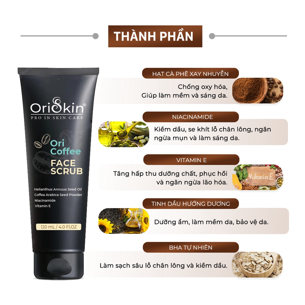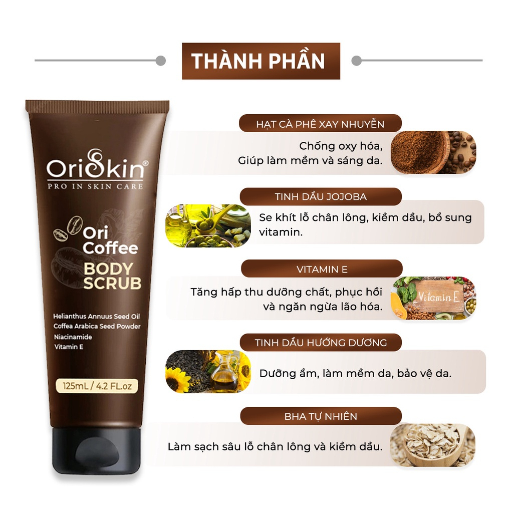 Tẩy tế bào chết cà phê cho mặt Ori Coffee Face Scrub và Tẩy tế bào chết cà phê cho body Ori Coffee Body Scrub với thành phần chính từ hạt cà phê nguyên chất xay nhuyễn kết hợp với các tinh dầu thiên nhiên như: tinh dầu jojoba, tinh dầu hướng dương,… giúp loại bỏ da chết hiệu quả nhưng vẫn vô cùng an toàn và lành tính. Nhờ khả năng tẩy tế bào chết nhẹ nhàng trên da, đồng thời cấp ẩm và làm dịu làn da, không gây khô rát hay kích ứng trong suốt quá trình sử dụng.