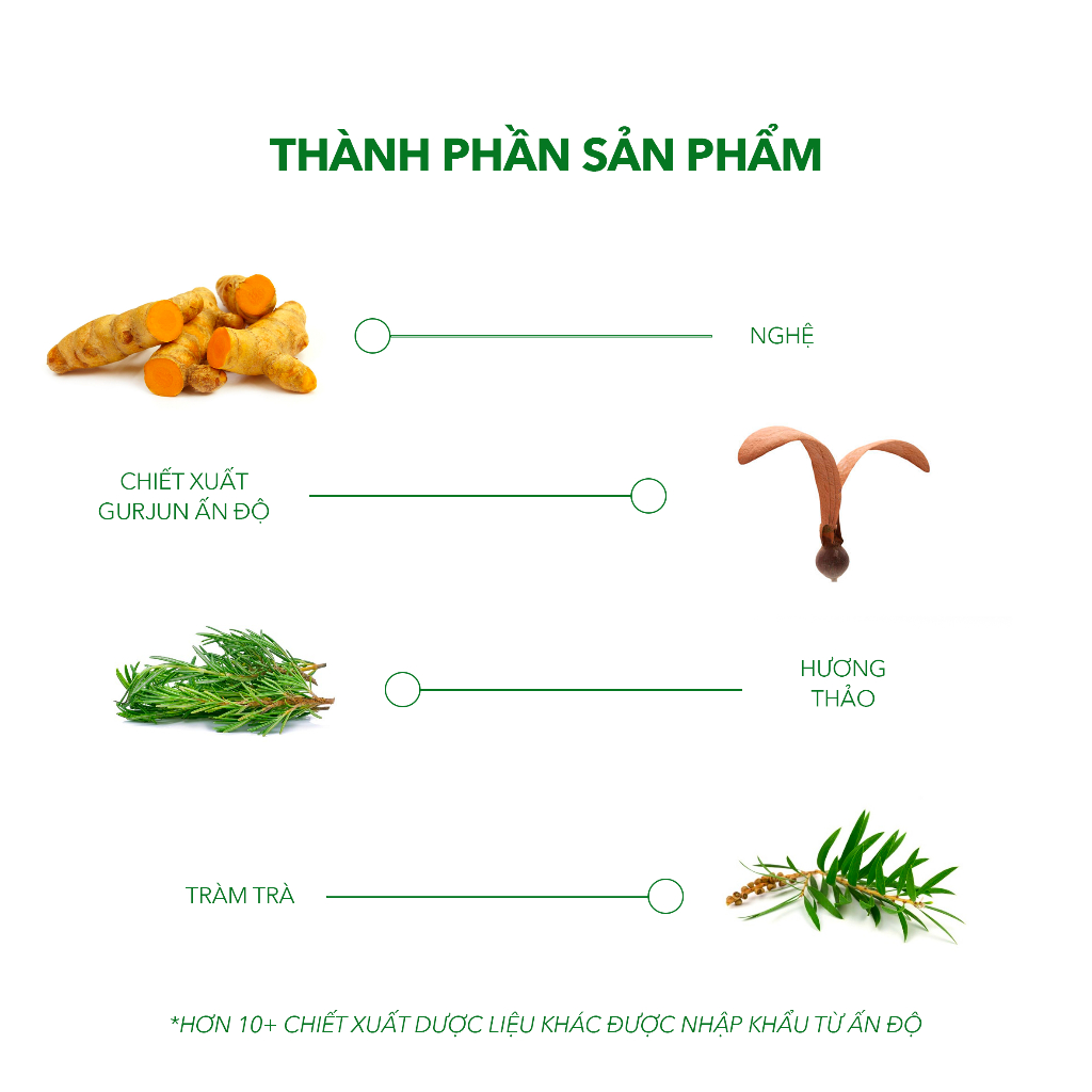 Chiết xuất Gurjun Ấn Độ, chiết xuất Gừng, Nghệ, Hương thảo, Oải hương,Nguyệt quế, Tràm trà, Hạt Carrot, chiết xuất Neem, Vitamin,….