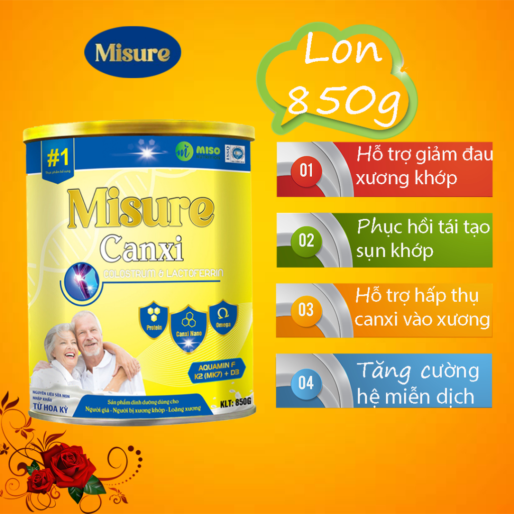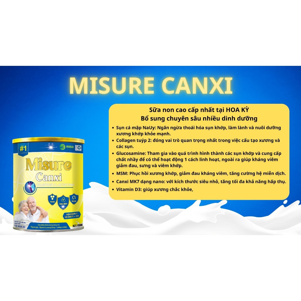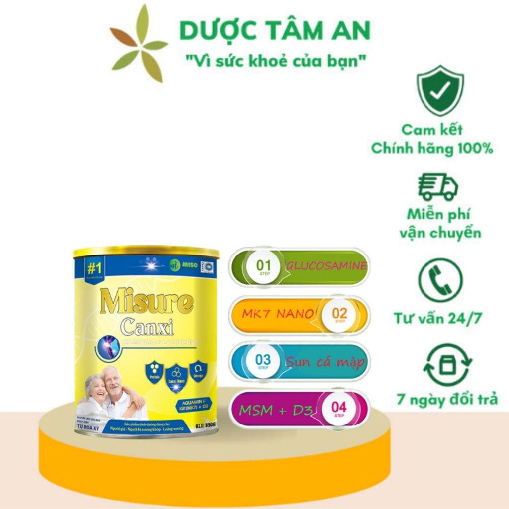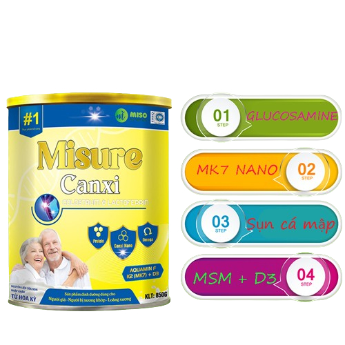 Sữa Misure canxi bổ sung nano canxi MK7 tăng khả năng hấp thụ canxi vào xương khớp. Chondroitin trong sụn vi cá mập giúp bổ sung nước và tái tạo mô sụn, hỗ trợ phục hồi các dây chằng, gân quanh khớp. Còn Glucosamine lại làm tốt nhiệm vụ giảm sưng viêm và bôi trơn ổ khớp, ngừa thoái hóa khớp. Sự kết hợp sụn vi cá mập và Glucosamine sẽ giảm đau, sưng, viêm khớp hiệu quả và nhanh hơn.