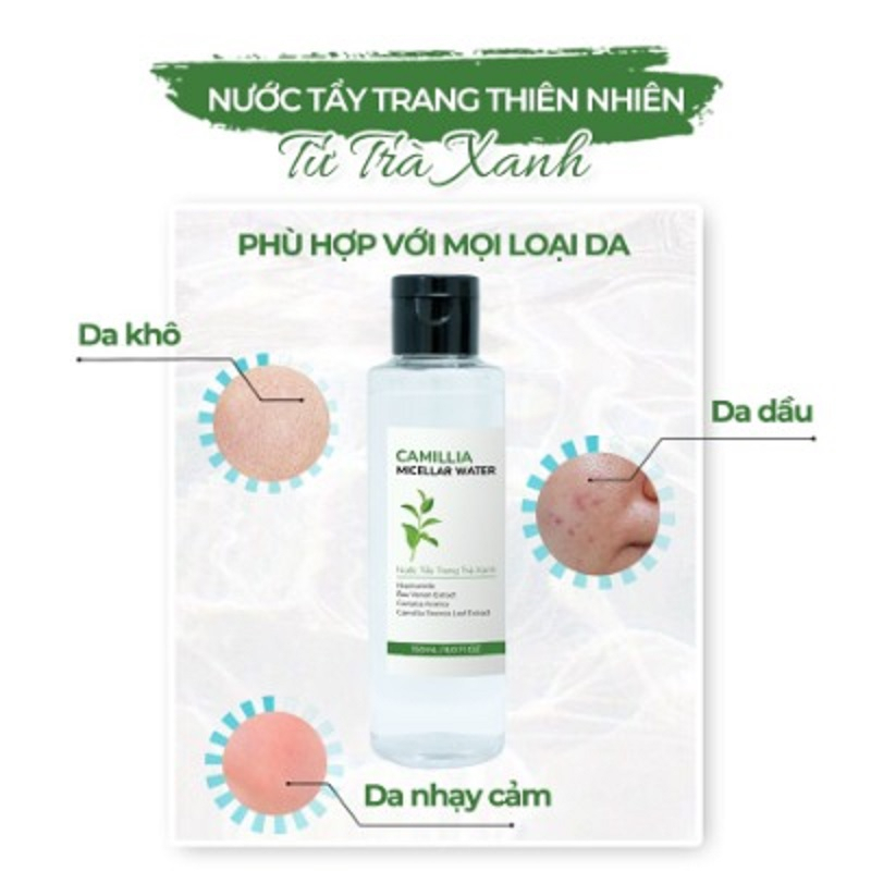 Nước tẩy trang từ trà xanh thiên nhiên Camellia Micellar Water với công dụng vượt trội trong việc lấy đi các bụi bẩn, bã nhờn, cặn mỹ phẩm,… mà còn giúp làn da giữ được độ căng bóng, mịn màng. Với kết cấu dạng nước mỏng nhẹ, không gây bí da, thích hợp với hầu hết mọi loại da kể cả da dầu và da khô.