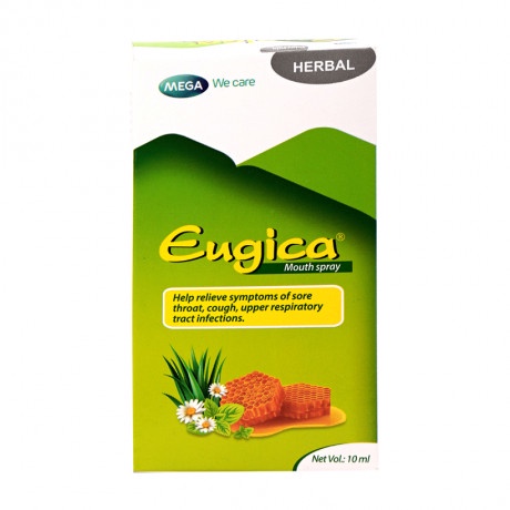 Xịt họng thảo dược Eugica với thành phần chứa mật ong, chiết xuất cúc la mã, tinh dầu bạc hà,…giúp giảm các triệu chứng viêm họng, ho, viêm đường hô hấp trên.