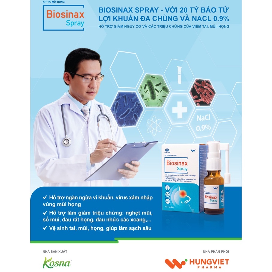 Xịt mũi họng Biosinax Spray, chứa 20 tỷ bào tử lợi khuẩn đa chủng và NaCl, lọ 20ml-Tổng Kho Úc Shop