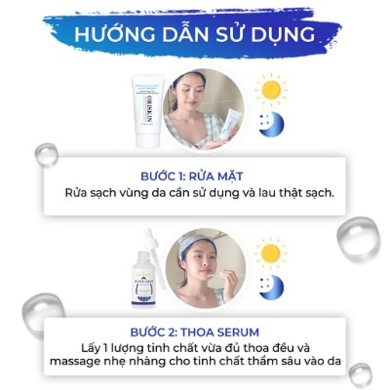 Bước 1: Rửa sạch vùng da cần sử dụng và lau thật sạch. Bước 2: Lấy 1 lượng tinh chất vừa đủ thoa đều và massage nhẹ nhàng cho tinh chất thấm sâu vào da.