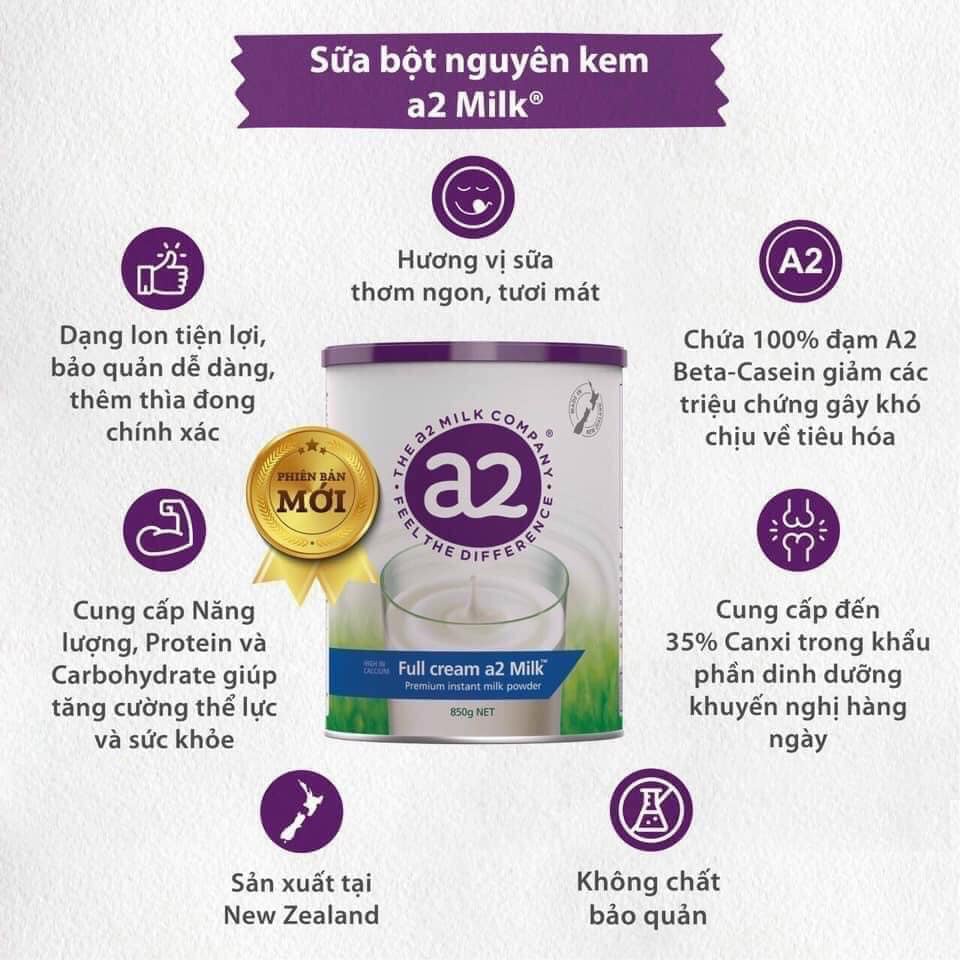 Hiện nay, trên thị trường sữa Việt Nam đang nổi tiếng dòng sữa tươi dạng bột A2. Đây là sản phẩm đã được cô đặc từ sữa của những con bò thuần chủng, không biến đổi gen có hương vị béo ngậy, ngọt thanh, dễ uống cung cấp nhiều dưỡng chất quan trọng cho cơ thể và đặc biệt phù hợp cho cả gia đình. Sữa A2 của Úc là sản phẩm sữa tươi dạng bột nguyên kem do công ty A2 Milk Company sản xuất và phân phối. Đây là công ty nổi tiếng chuyên kinh doanh sữa và các sản phẩm làm từ sữa cho mẹ và bé. Sữa A2 dạng sữa tươi được cô đặc để dễ dàng trong quá trình vận chuyển sữa. 1kg sữa tươi dạng bột sẽ pha được 7 lít sữa tươi.