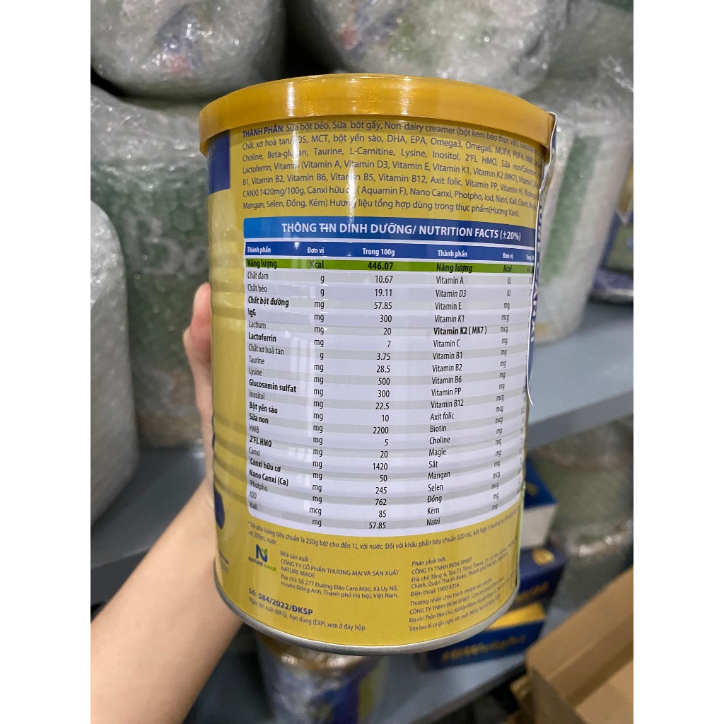 Sữa bột béo, Sữa bột gầy, Non-diary creamer (bột kem béo thực vật), Glucosamin, Chất xơ hoà tan, MCT, bột yến sào 10mg/100g, DHA, EPA, Omega3, Omega6, MUFA, PUFA, HMB, Lactium, Choline, Beta-glucan, Taurine, L-Carnitine, Lysine, 2’FL HMO, Sữa non, Lactoferrin, Vitamin (Vitamin A, Vitamin D3, Vitamin E, Vitamin K1, Vitamin K2 (MK7), Vitamin C, Vitamin B1, Vitamin B2, Vitamin B6, Vitamin B5, Vitamin B12, Axit folic, Vitamin PP, Vitamin H), Khoáng chất (CANXI 1420mg/100g, Canxi hữu cơ (Aquamin F), Canxi Nano, Photpho, Iod, Natri, Kali, Clorid, Magie, Sắt, Mangan, Selen, Đồng), Hương liệu tổng hợp dùng trong thực phẩm.