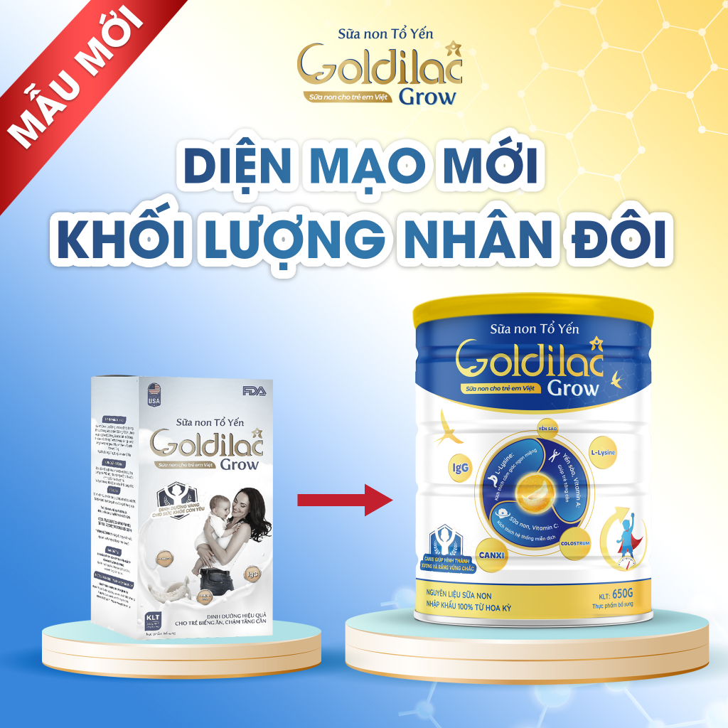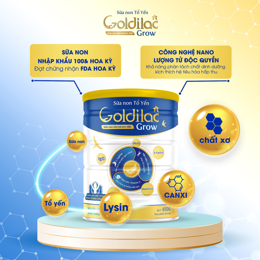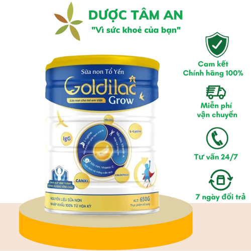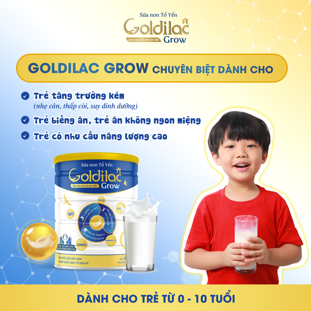 Sữa non Tổ Yến Goldilac Grow dành riêng cho trẻ từ 0 – 10 tuổi giúp tăng sức đề kháng, trẻ ăn ngon, ngủ ngon, phát triển toàn diện. Goldilac Grow đã được chứng nhận an toàn thực phẩm nên các mẹ hoàn toàn yên tâm cho bé sử dụng.