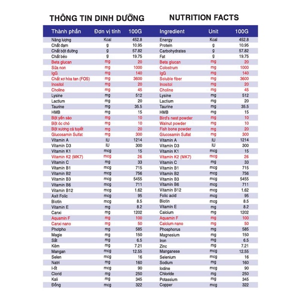– Nhóm các dưỡng chất thiết yếu: Chất xơ hòa tan FOS, Glucosamin sulfat, Sữa non, Lysine, Choline, Aquamin F, Bột yến sào, Bột óc chó, Bột xương cá tuyết, Beta Glucan, Lactium, Taurine, IgM, HBM,…