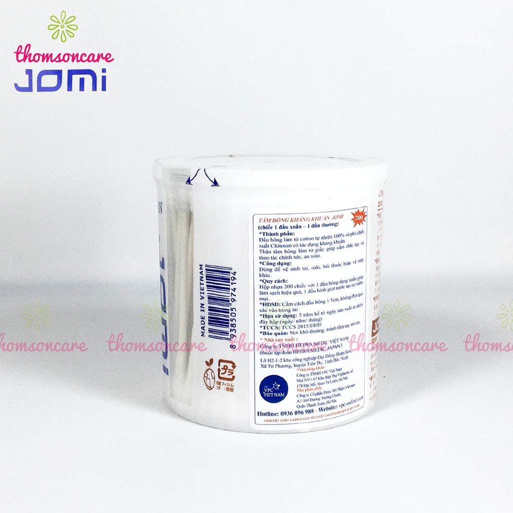 Tăm bông kháng khuẩn Jomi với đầu bông làm từ cotton tự nhiên 100% phủ chiết xuất Chitosan có tác dụng kháng khuẩn, thân tăm bông làm từ giấy giúp cầm chắc tay và thao tác chính xác, an toàn. Thiết kế hộp tăm bông đẹp mắt, tiện lợi, có thể sử dụng trong nhiều trường hợp như vệ sinh tai, mũi…