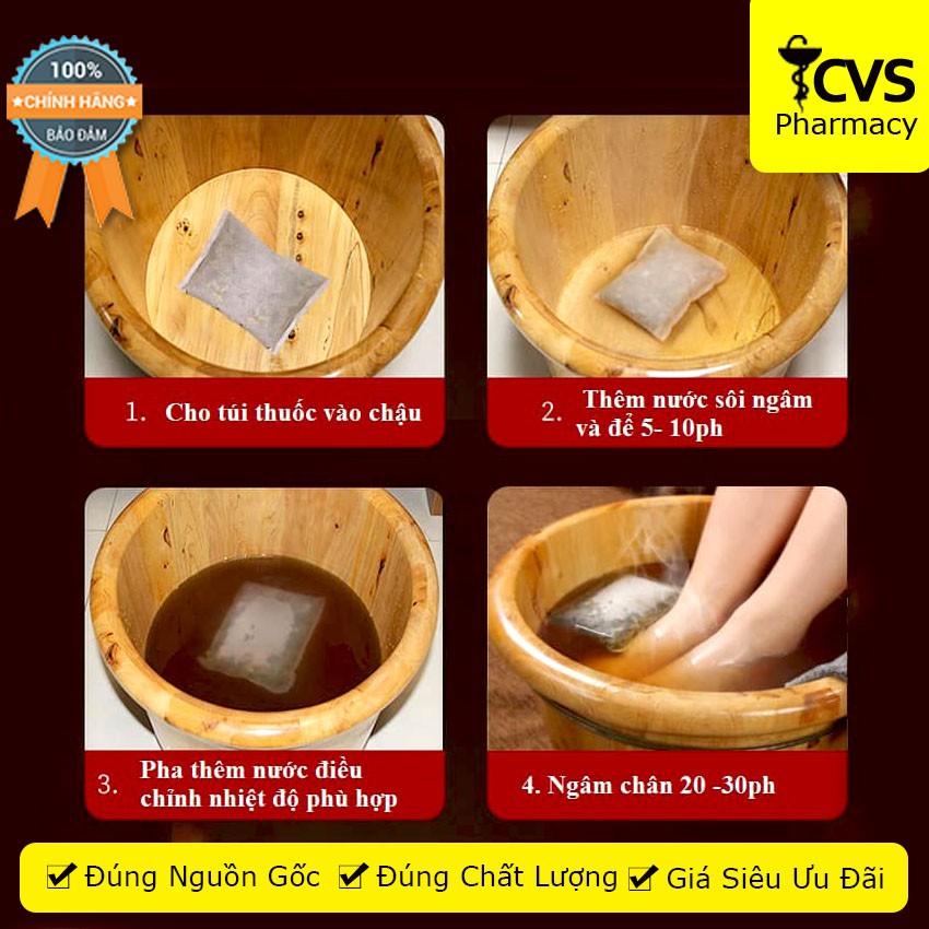 * Ngâm chân trong vòng 15 – 25 phút, vừa ngâm vừa giẫm lên túi thuốc cho hoạt chất phai ra. Không ngâm tới lúc nước nguội, quá trình ngâm có thể chế thêm nước nóng để giữ nhiệt. Ngâm xong lau sạch chân bằng khăn khô. Đi ngủ ngay nếu có thể.