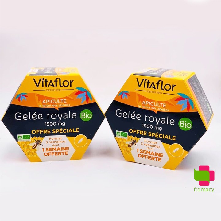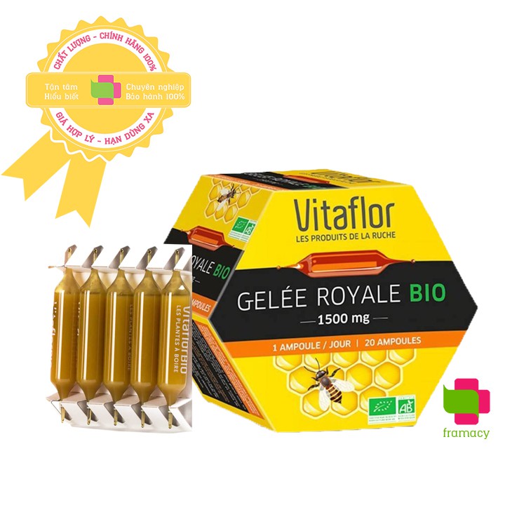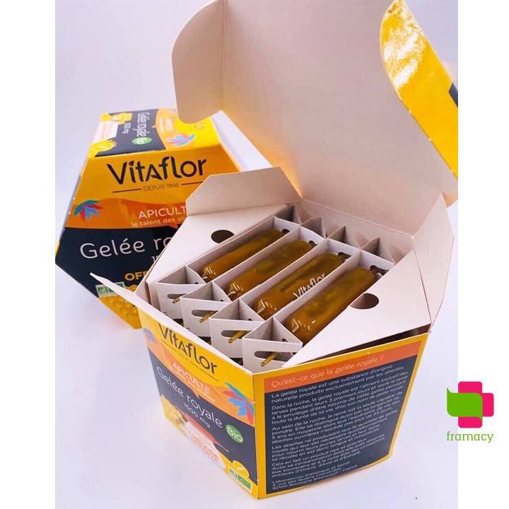 Với hàm lượng cao các vitamin, khoáng chất, chất chống oxy hóa và đặc biệt là nguồn tự nhiên duy nhất cung cấp axit ong chúa (10-DHA), sữa ong chúa không chỉ mang đến hiệu quả cao trong bồi bổ cơ thể, nâng cao sức khỏe con người mà còn có tác dụng vượt trội trong làm đẹp da, tóc, cải thiện các khuyết điểm trên da như: thâm nám, tàn nhang, sạm da. Sữa Vitaflor Gelée Royale Bio là sản phẩm sữa ong chúa đến từ thương hiệu Vitaflor nổi tiếng tại Pháp. Sản phẩm được điều chế 100% từ sữa ong chúa tươi thiên nhiên bằng công nghệ sinh học hiện đại với độ tinh khiết cao giúp lưu giữ trọn vẹn những tinh chất quý giá, thành phần dinh dưỡng có lợi cho sức khỏe, làn da và mái tóc.