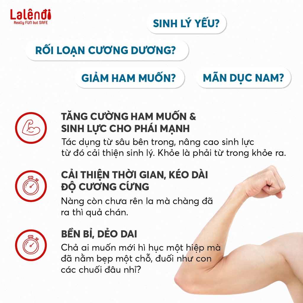 – Tăng khoái cảm tình dục, kéo dài thời gian giao hợp. Kích thích sản xuất nội tiết tố nam trong cơ thể 1 cách tự nhiên, kéo dài thời gian mãn dục nam giới.