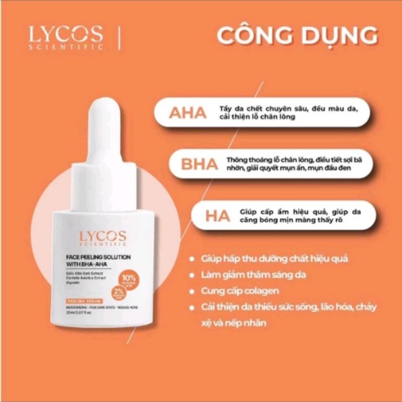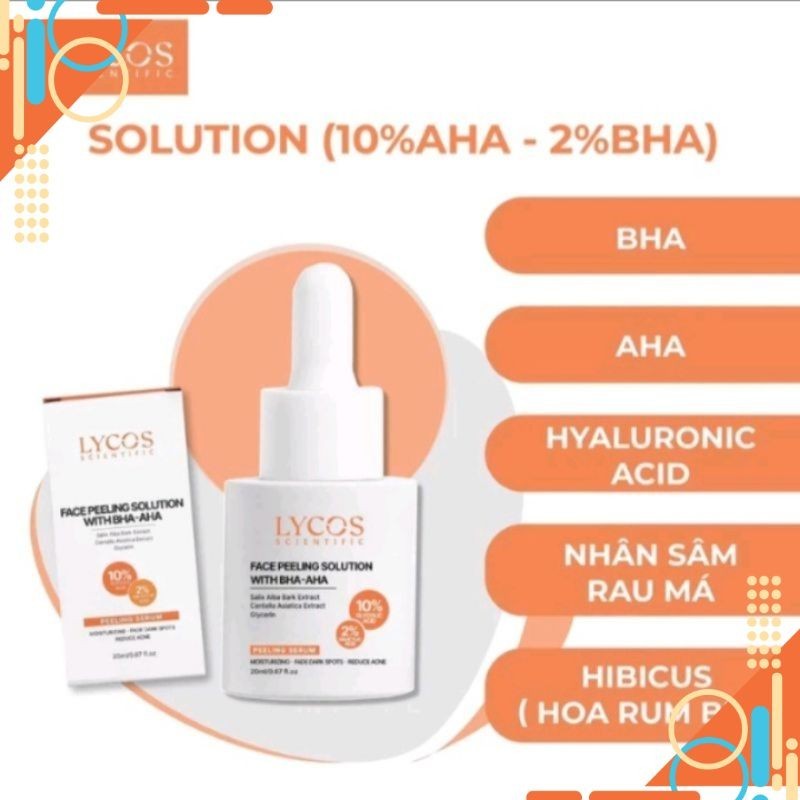 – Lycos Face Peeling solution 10%AHA và 2%BHA là dạng tẩy tế bào chết chuyên sâu, (Glycolic, Salicylic acid, Hyaluronic acid) kết hợp vỏ cây liễu giúp tác động sâu thông thoáng lỗ chân lông giải quyết tình trạng tắc nghẽn, hỗ trợ giải quyết mụn ẩn, mụn đầu đen và thâm mụn hiệu quả, loại bỏ lớp sừng trên bề mặt da, tái tạo lại tế bào da mới, dưỡng da căng mịn và đều màu…