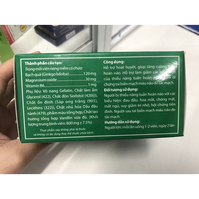 Thành phần : Gingko biloba ..Magnesium Oxide – Vitamin B6 – Gelatin – Glycerin – Sorbitol . Soybean oil . Lecithin . Bee wax . Vanillin
