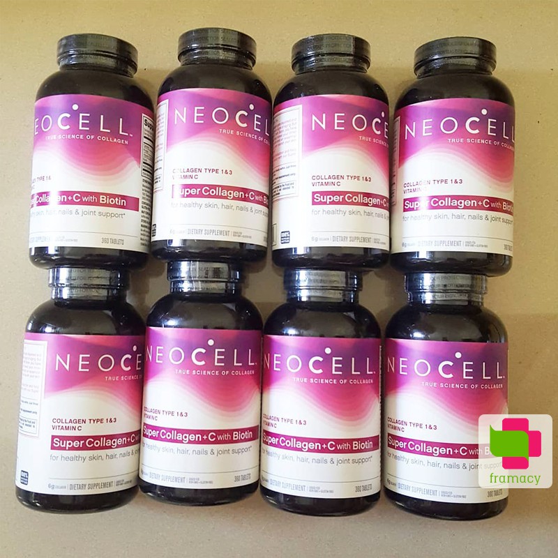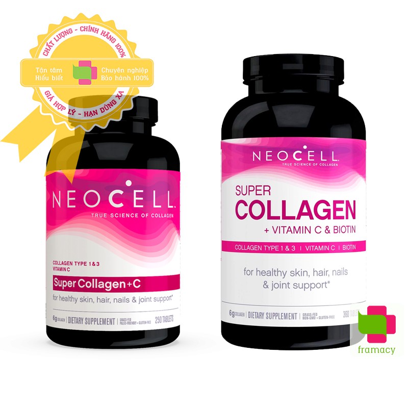 Collagen là thành phần chính của cơ gân xương khớp tóc móng răng, sụn, dây chằng, giác mạc, collagen chiếm 25% tổng lượng protein trong cơ thể con người, chiếm 75% cấu trúc da, chiếm 3/4 thể tích của da. Collagen có nhiệm vụ kết nối các mô trong cơ thể lại với nhau và đảm nhận tính co giãn của da. Vì thế khi cơ thể bị thoái hóa do quá trình lão hóa thì da sẽ bị chùng nhão, kém săn chắc, làm cho hắc tố trên bề mặt của da bị thay đổi. NeoCell Super Collagen + Vitamin C & Biotin, Mỹ là viên uống chứa collagen nguyên chất kết hợp với vitamin C giúp hỗ trợ tốt cho xương khớp, hỗ trợ làm đẹp da, tóc và móng. Sản phẩm đến từ thương hiệu Neocell của Mỹ nổi tiếng trong lĩnh vực nghiên cứu và phát triển các sản phẩm làm đẹp, chăm sóc da tự nhiên.