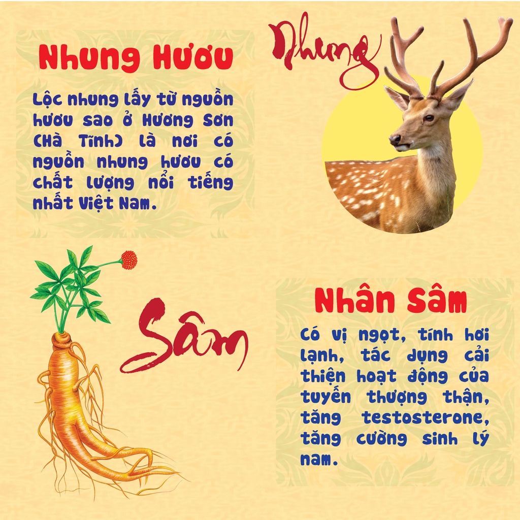 – Lộc nhung 60mg, Nhân sâm 45mg, Hải mã 100mg, Dâm dương hoắc 200mg, Thỏ ty tử 250mg, Phúc bồn tử 20mg, Câu kỷ tử 250mg, Cửu thái tử 20mg, Thạch liên tử 30mg, Phá cố chỉ 15mg, Xà sàng tử 150mg, Kim anh tử 25mg, Ngũ vị tử 30mg, Thục địa 40mg.