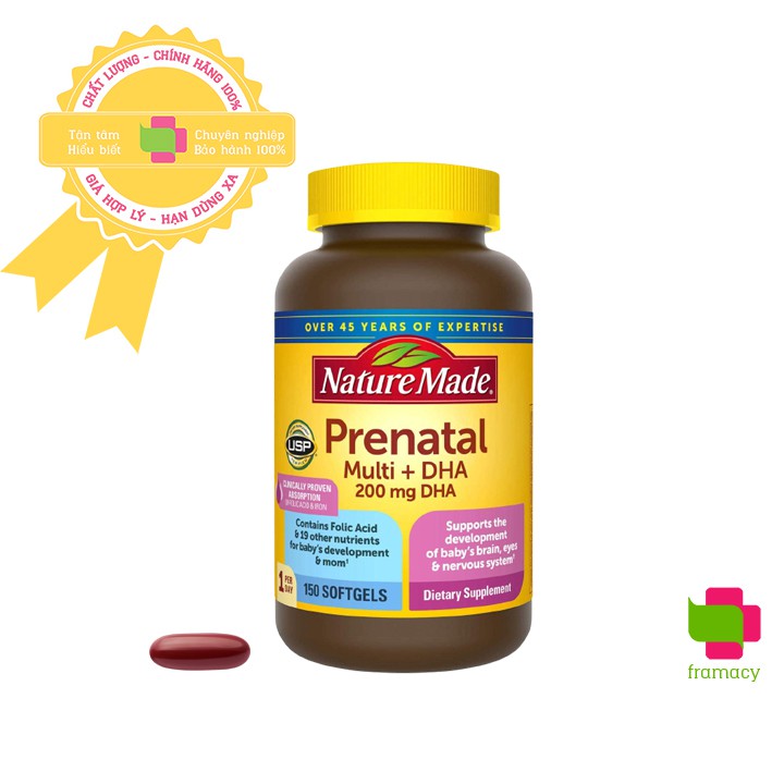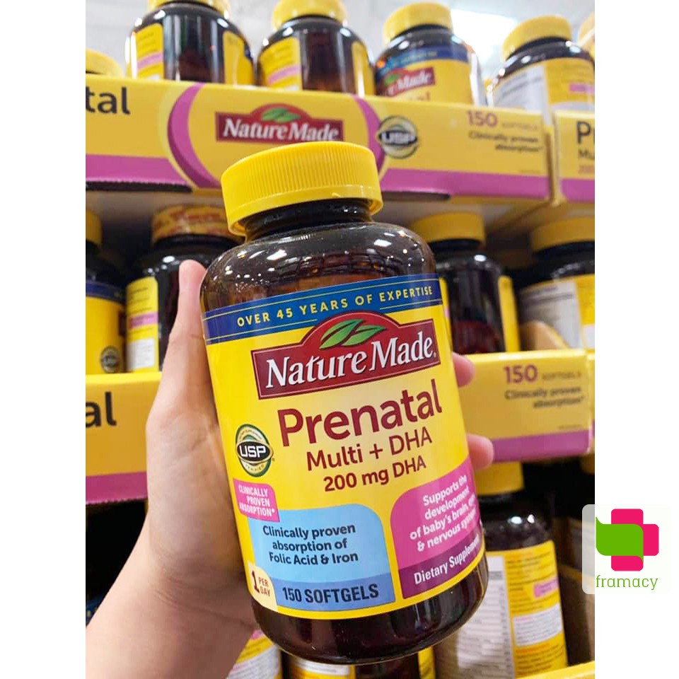 Vitamin tổng hợp bầu Nature Made Prenatal Multi + DHA, Mỹ (150v) bổ sung dinh dưỡng, DHA cho mẹ bầu và sau sinh.