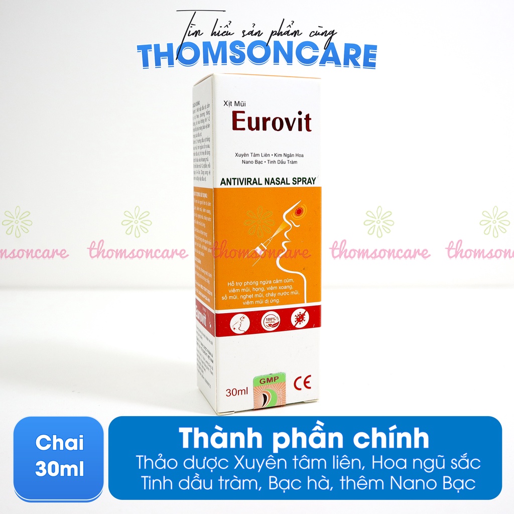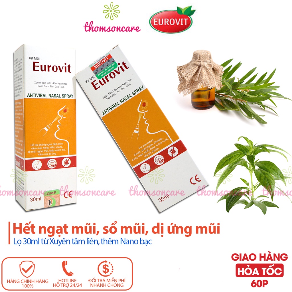 Xịt mũi Eurovit giúp giảm ngạt mũi, thông mũi, phòng ngừa cảm cúm – Lọ 30ml từ xuyên tâm liên, thêm nano bạc.